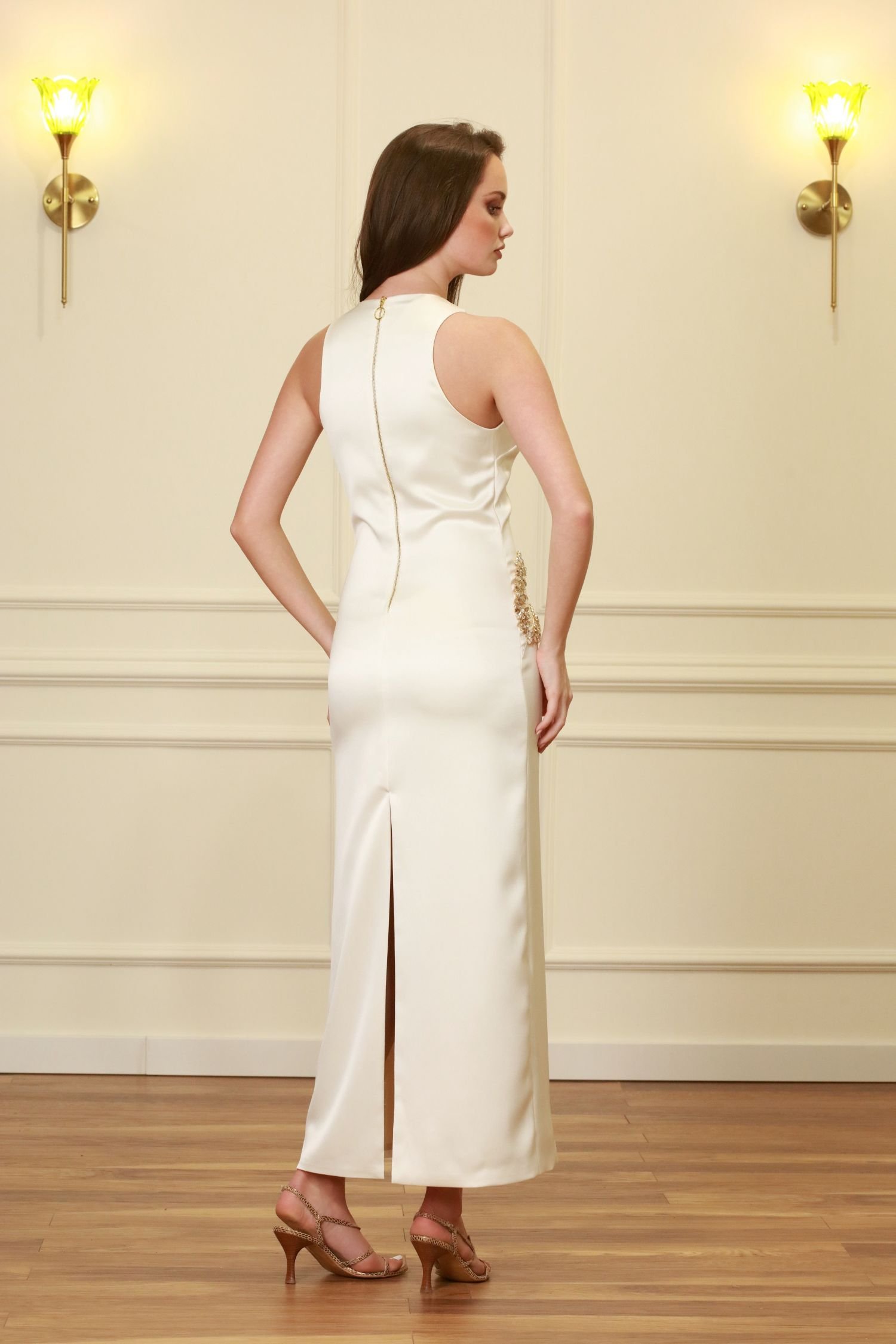 The gown is finished with a signature golden zipper at the back for effortless wear. Fully lined to ensure a smooth, flawless finish, this dress is designed for those who want to command the room with grace and edge.