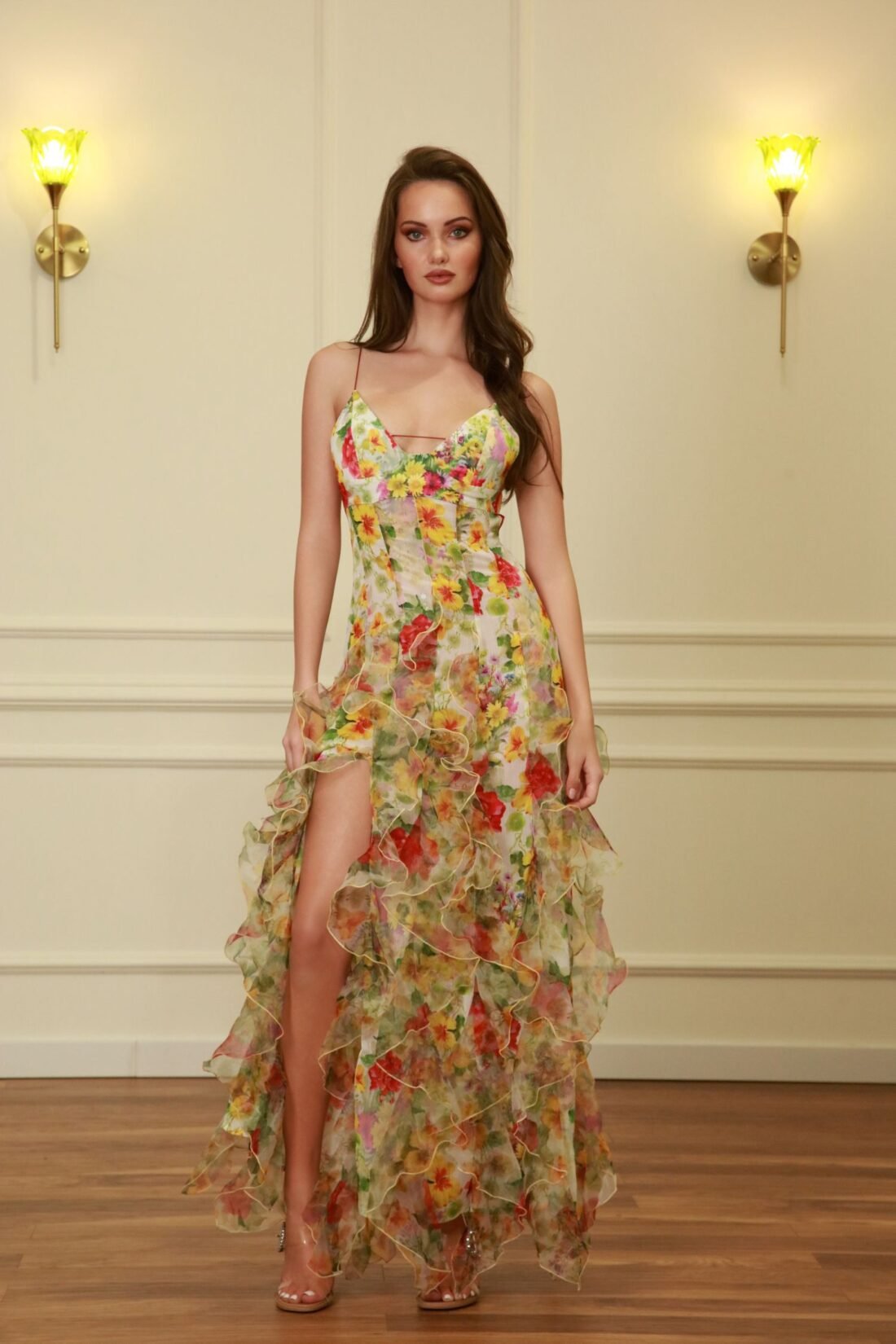 Crafted from lightweight airy chiffon-georgette it envelops you in comfort while allowing complete freedom of movement. Each cut is intersected by internal dainty rails and traced with flouncy organza ruffles to create a feeling of whimsical style. Perfect for summer months, this dress features delicate spaghetti-adjustable straps and it fastens with a concealed zip closure at the back and a ruched fabric with elastic band within for easy on .