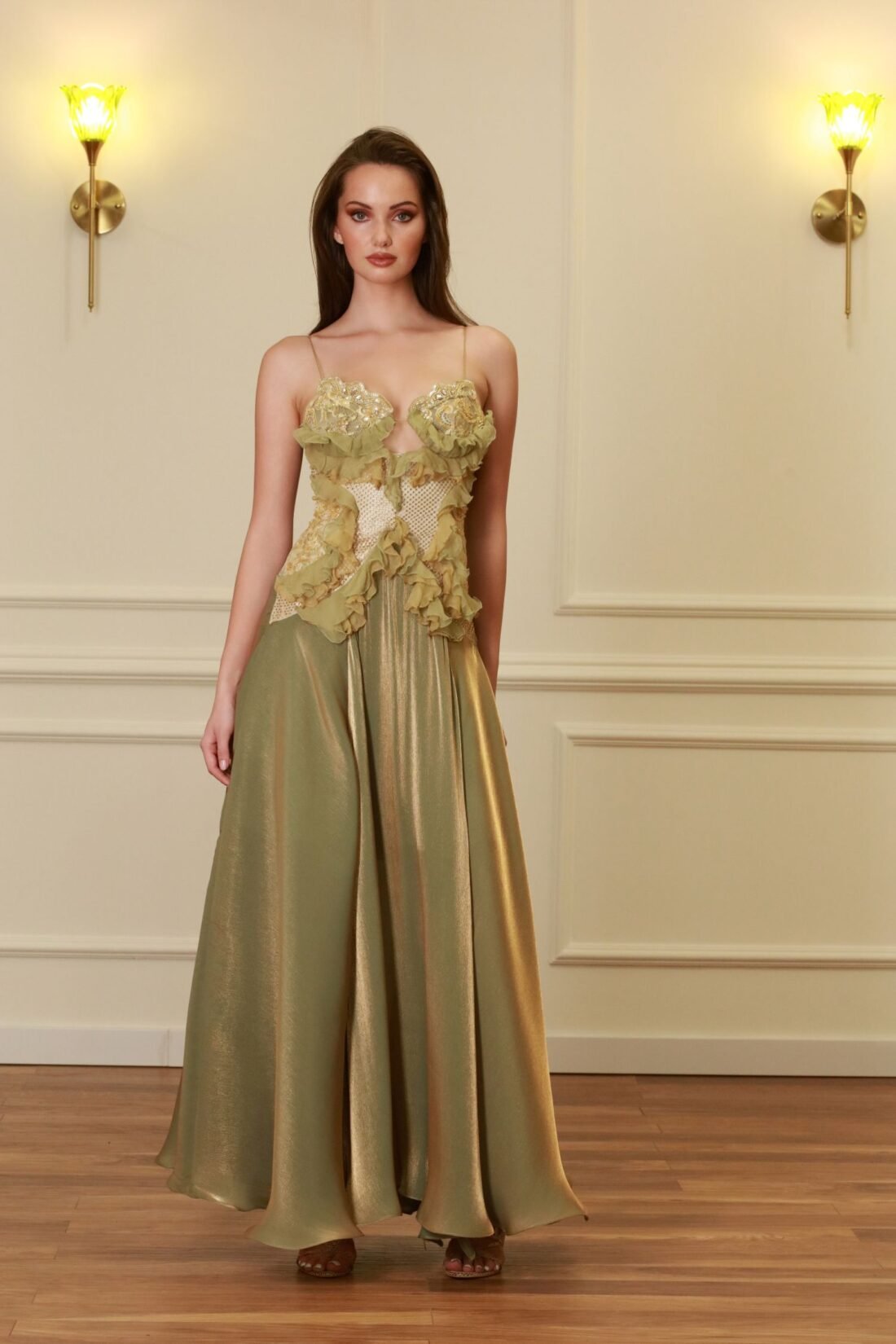The silhouette is defined by a contemporary bustier, featuring an architectural cut-out elegantly framed by hand-embroidered French lace. Soft silk ruffles soften the demi-cups, while a golden beaded trim traces the décolletage, leading to dainty spaghetti straps that offer a graceful lift and a timelessly flattering frame.