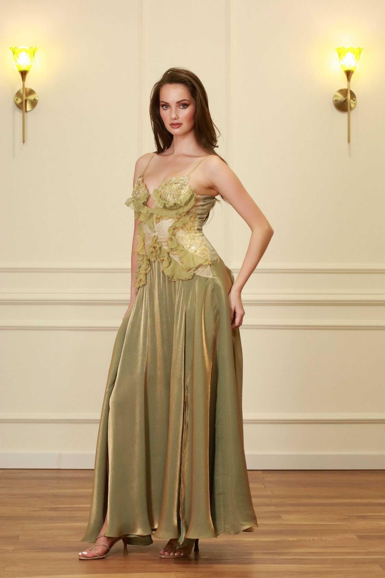 The design flows into a dramatic, bias-cut skirt crafted from premium changeant fabric. This iridescent material captures the light, shifting colors with every movement to create a “liquid silk” effect. For a daring yet sophisticated touch, the skirt features dual front slits—carefully lined to ensure effortless movement while maintaining complete coverage.